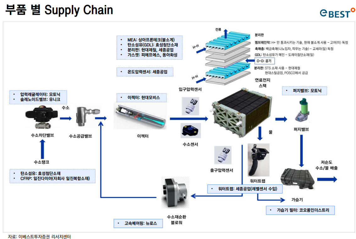 수소차의 핵심 부품은 크게 1.연료전지스택 2. 수소공급장치. 3. 공가공급장치 4. 열관리장치. 5수소저장장치 6기타 전장부품등으로 구분 지을 수 있다. 수소차의 대중화 시대가 열릴 때 완성차 이상으로 큰 수혜를 누릴 수 있는 업체들은 바로 부품 소재 업체들이다.